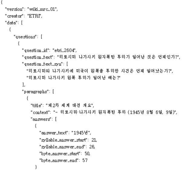 ETRI 데이터 형식은 다음과 같으며, 이를 SQuAD 형식으로 변환하는 작업을 진행하였다. 먼저, answer_start를 공백과 특수문자까지 포함하여 계산하는 단위로 변환하는 함수를 정의하였다. SQuAD 형식에서는 공백과 특수문자를 포함해 answer_start를 계산하지만, ETRI 형식은 이를 제외하고 한글 음절 단위로만 계산하였다. 따라서, 공백과 특수문자를 포함한 정확한 answer_start를 도출하는 과정을 추가하였다.