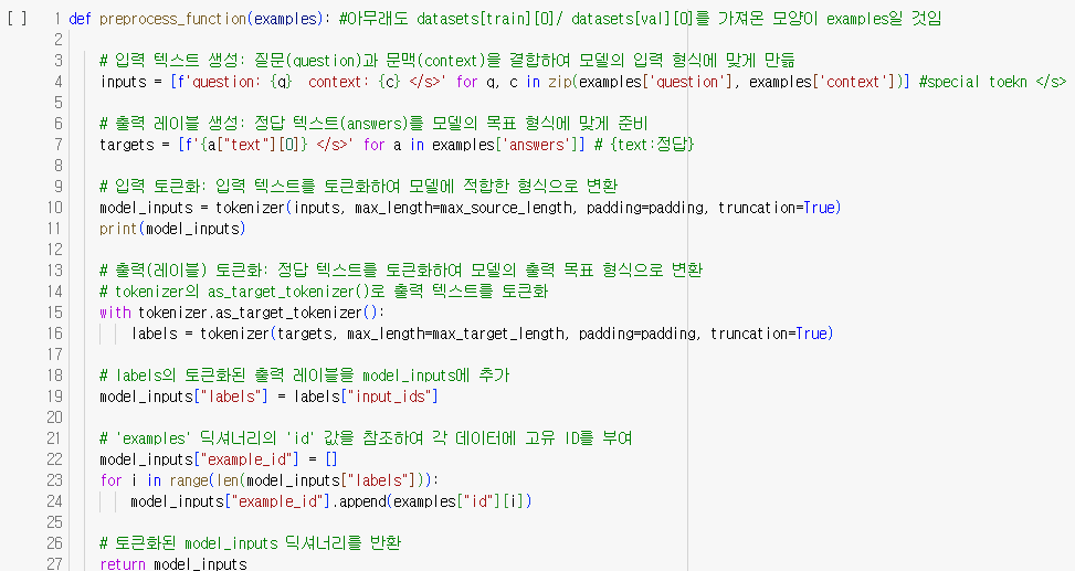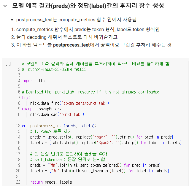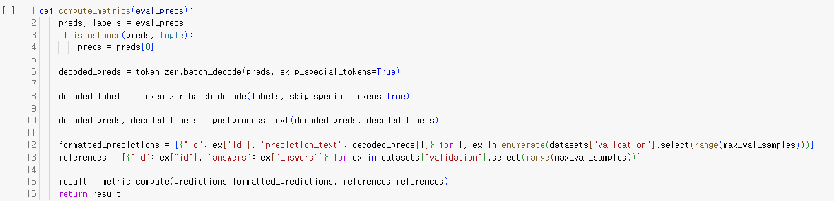 EM 모델은 생성한 답변이 정답과 정확히 동일한 경우에만 점수를 부여하기 때문에 Generation-based-model에는 맞지 않는다. 따라서, F1 score을 기반으로 정확도를 평가해보려고 한다. 모델을 학습시키기 전에 compute_metrics라는 함수를 정의해주었다. 이함수는 모델의 예측값과 정답데이터를 decoding(해독)하여 SQuAD 평가 지표로 성능을 평가한다. 먼저,입력값으로는 모델이 생성한 예측값(preds)와 정답(labels)로 구성된다. 예측값이 튜플 형식일 경우, 첫번째 요소만 사용한다. 그다음 예측값(preds)와 정답(labels)를 decoding 하고 앞에서 정의한 postprocess_text 함수로 텍스트 후처리를 해준다. 결과값으로는 metrics 지표를 출력해준다.