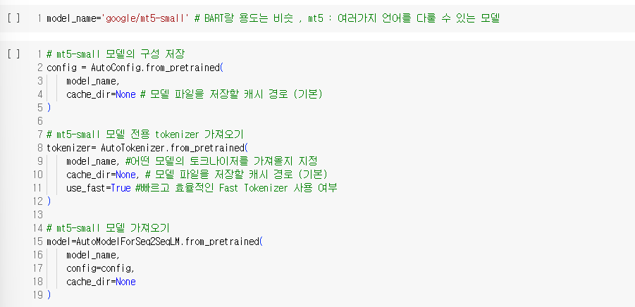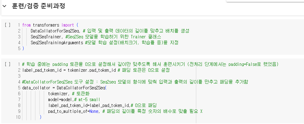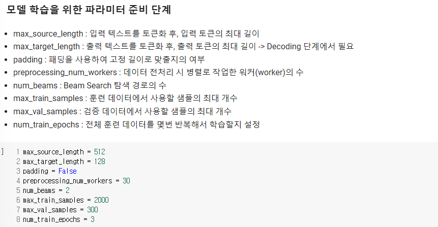 모델은 goggle에서 사용하는 mt5-small 모델을 가져왔으며, Pretrained 된 모델을 객체로 저장하는 작업을 실행하였다. 이 단계에서 모델 학습을 위한 파라미터 8가지도 정의해주었다.