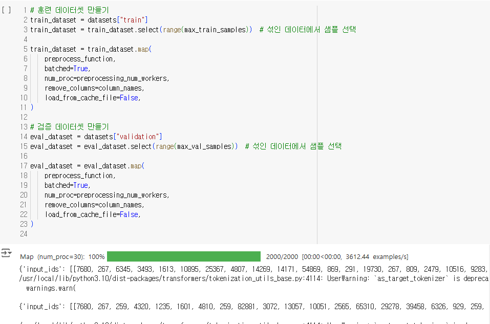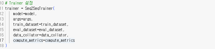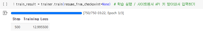 학습/검증/평가에 필요한 설정은 다음과 같이 정의했다. 위에서 정의한 파라미터를 Seq2SeqTrainer에 넘겨주어 학습을 진행하였다. 실제 학습은 사이트에서 API 키를 받아와 실행하였다.