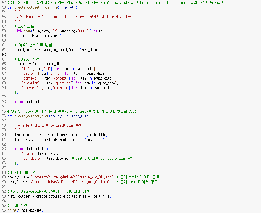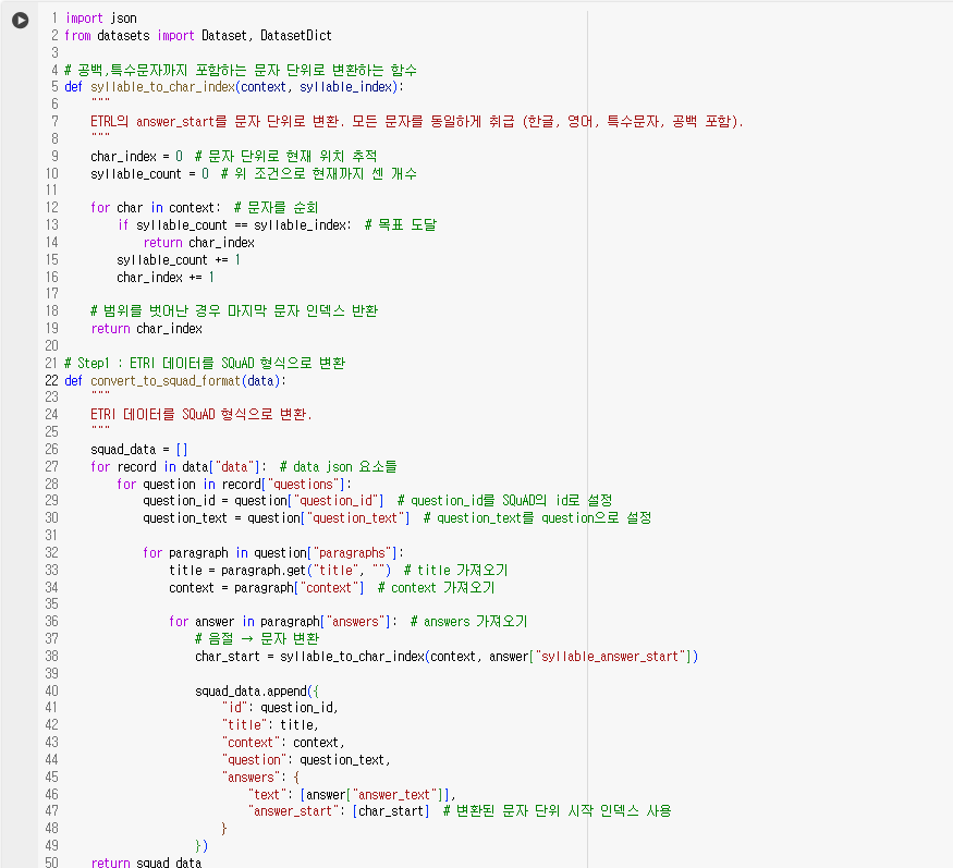 그 다음으로, ETRI 데이터를 SQuAD 형식으로 변환하는 함수를 정의했다. ETRI 형식의 JSON 파일을 변환하는 작업을 실행하고, 이를 각각 train_dataset과 test_dataset으로 분리하는 작업을 진행하였다. 마지막으로 이렇게 변환된 train과 test 데이터를 하나의 데이터셋으로 통합하여 저장하는 과정을 거쳤다. 이로써, 모델에 바로 적용할 수 있는 데이터 형식이 완성되었다.