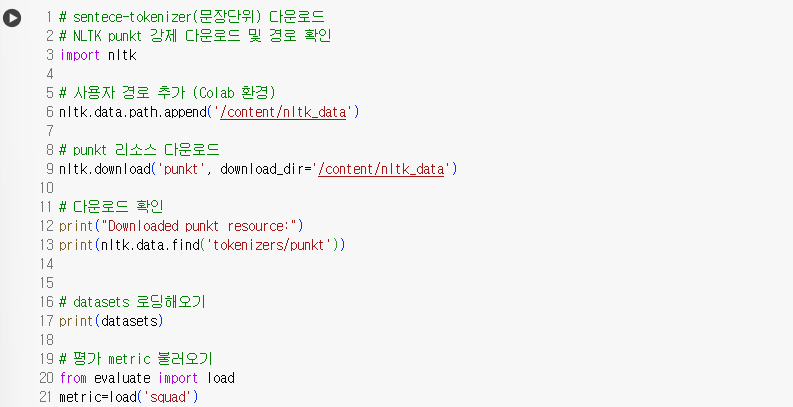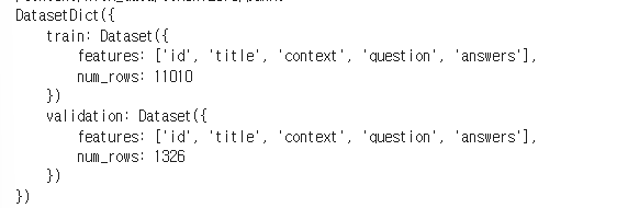 차례대로 SQuAD 형식으로 변환한 datasets와 문장 단위로 토큰화 해주는 nltk의 punkt tokenizer를 불러왔다. evaluate에 들어있는 squad metric도 불러와주었다. Dataset 형식은 아래와 같다. train dataset에는 11010개 행이 있고, test dataset은 1326개 행이 존재했다.