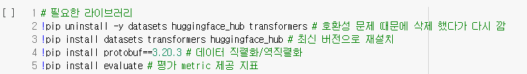 관련 패키지로는 Huggingface_hub,Transformer,Protobuf,Evaluate 를 가져왔다.