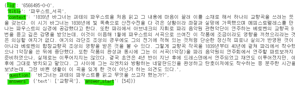다만, 부스트 코스에서 학습 한 코드를 이 데이터셋에 녹여내려고 하였으나, 데이터 형식이 맞지 않아 어려움을 겪었다. 그래서 SQuAD(Standford Question Answering Dataset) 형식으로 바꿔 데이터 변환을 진행하였다.