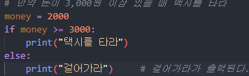 위 코드는 현금은 조건문을 만족하지 못하지만, card의 값이 True 이므로 '택시를 타라' 가 출력되게 된다. 만약 card의 값이 False였다면 그대로 '걸어가라' 가 출력되게 된다.