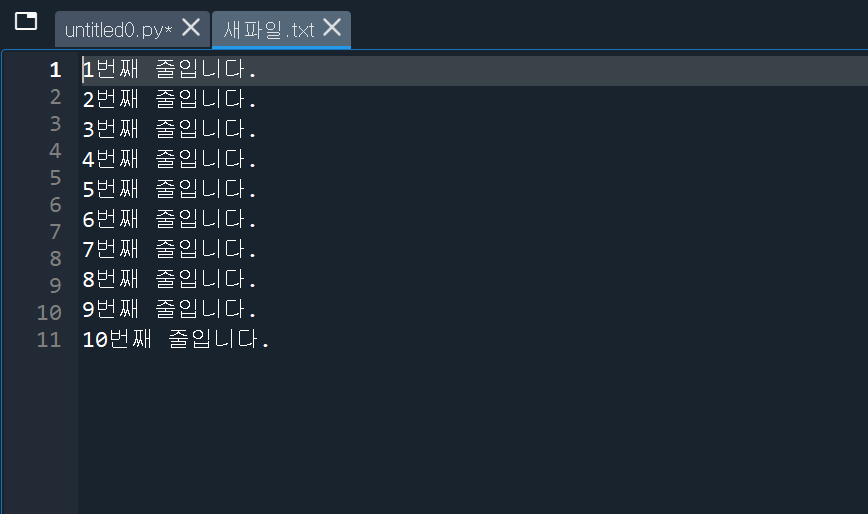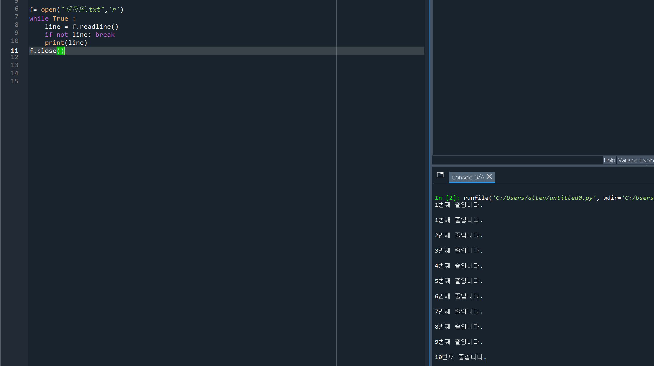 위에서 생성한 새파일.txt 라는 파일을 읽기 모드 r 을 사용하여 연 후 readline 함수를 사용하여 해당 파일의 첫번째 줄이 모니터에 출력되도록 한 예시이다.