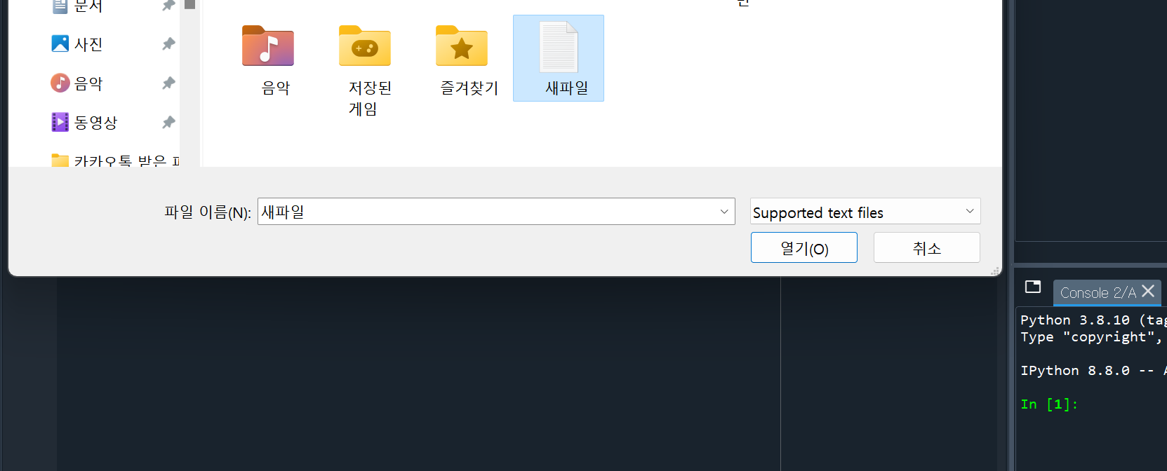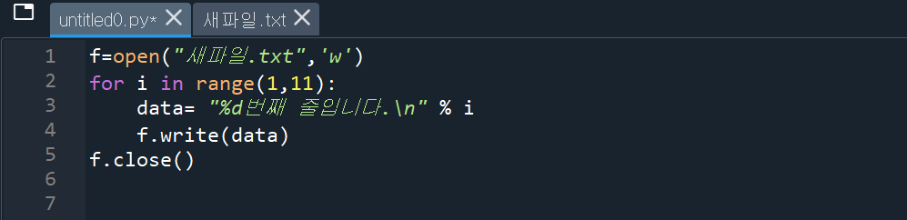 해당 코드를 입력하게 될 경우 디렉터리에 새로운 파일이 생기게 된다. 파일 생성을 위해 open 함수를 사용하였고, 위의 "새파일.txt" 은 파일명, 'w' 는 파일 열기 모드를 입력값으로 하고 결과값으로 파일 객체를 나타낸다.