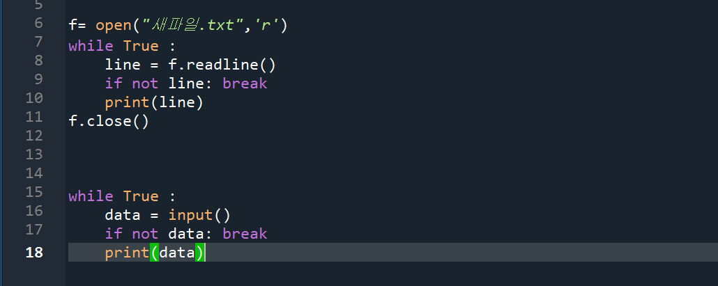 위의 예시처럼 첫번째 줄이 아닌 모든 줄을 모니터에 출력하고 싶다면 while True: 문을 이용하여 파일을 계속해서 읽어들이고, 파일의 마지막 줄을 읽고 리턴하기 위해 break를 수행한다. 무한 루프를 사용한 후 break를 수행하면 readline 함수는 더 이상 읽을 문자열이 없기에 빈 문자열을 리턴하여 데이터를 출력한다.