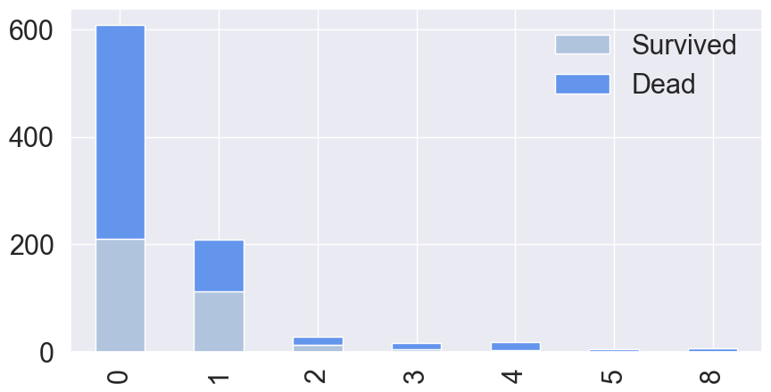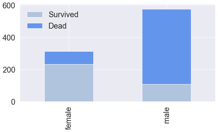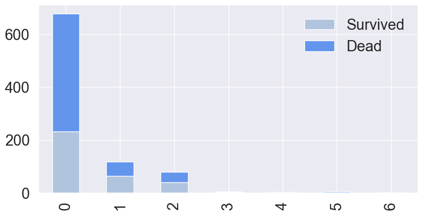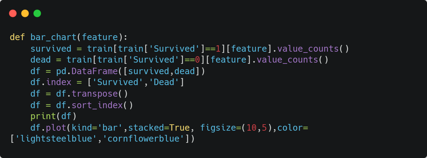 bar_chart()는 변수에 따른 생존자의 수와 사망자의 수를 시각화하는 함수입니다.