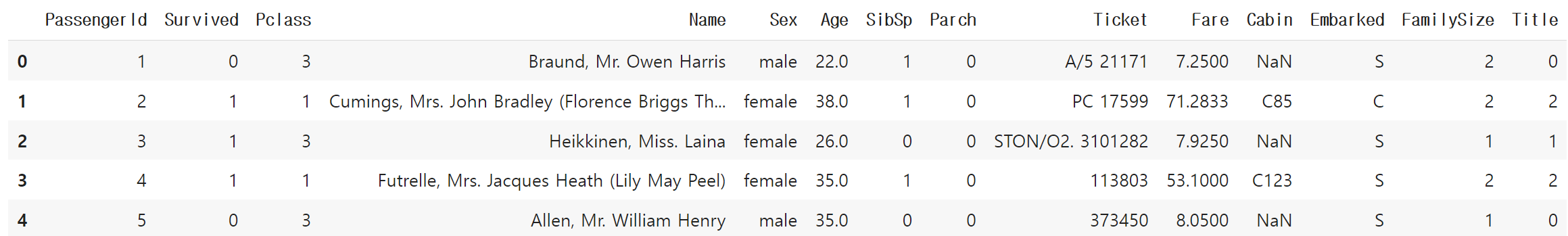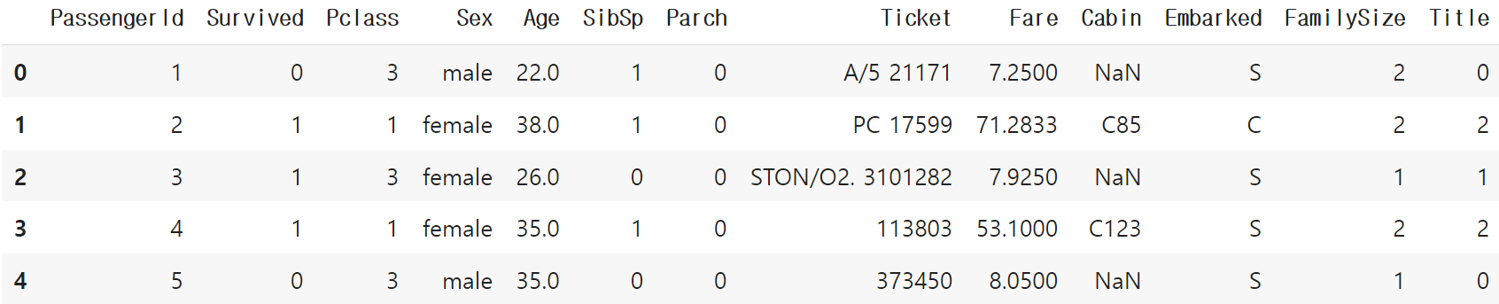 실행결과 train에서 Survived 행을 제외한 모든 행이 포함되어 음을 확인할 수 있습니다. 이는 최종 목표가 test 데이터셋의 정보들을 활용하여 탑승자의 Survived 값을 추정하는 것이기 때문입니다.