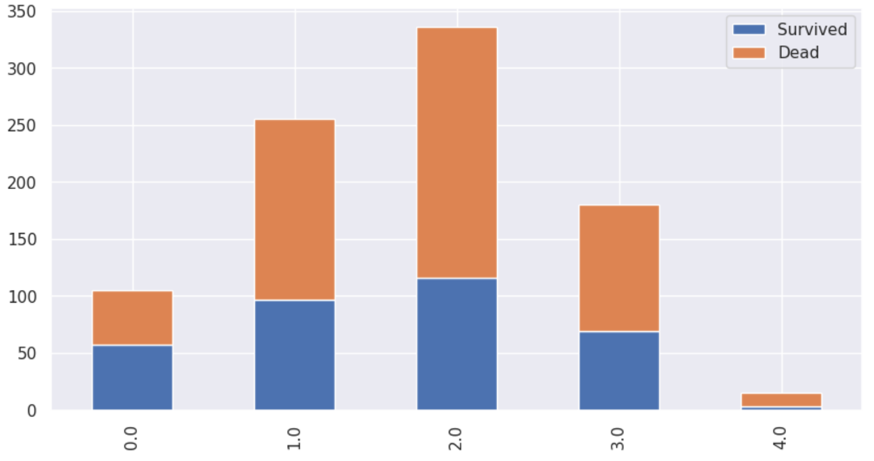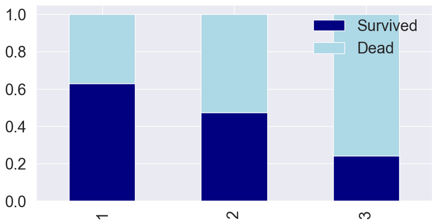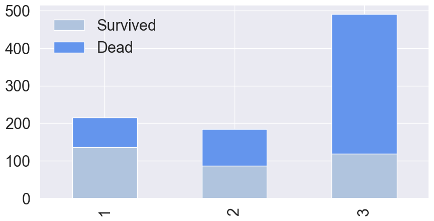 위에서 확인한 대로 높은 등급일수록, 젊을수록, 여성일수록 생존자가 많음을 다시 한번 확인할 수 있습니다.