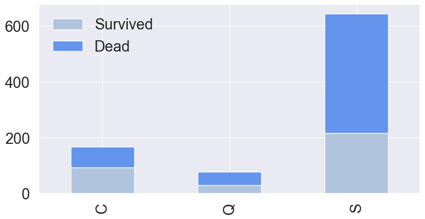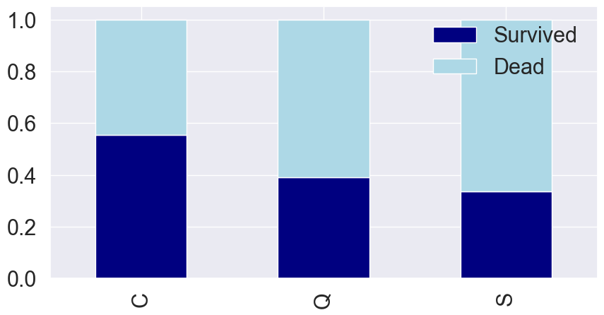 탑승 항구에 따른 생존율은 Cherbourg > Queenstown > Southampton 순서임을 확인할 수 있습니다.