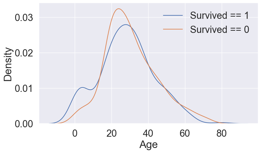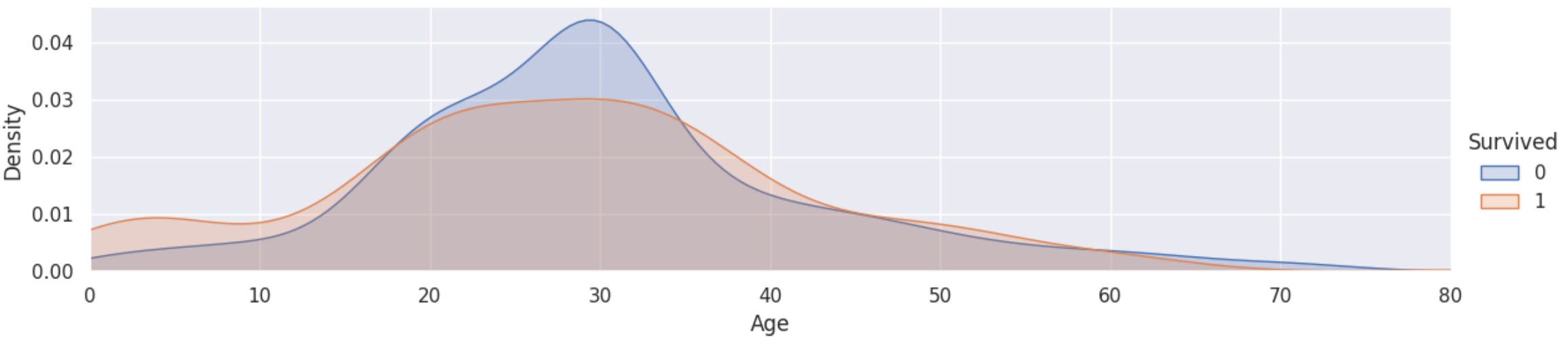 seaborn 라이브러리의 kdeplot을 활용하여 나이에 따른 생존자수와 사망자수를 시각화해 보았습니다.