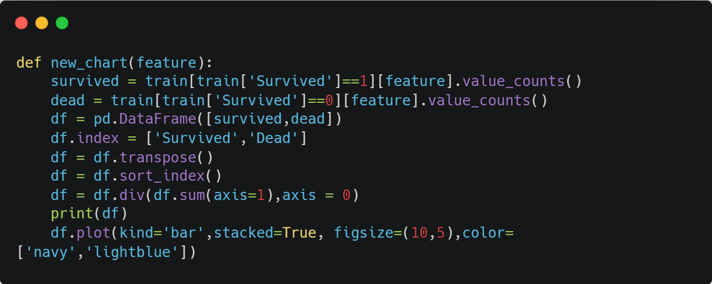 new_chart는 변수에 따른 생존자와 사망자의 비율을 시각화하는 함수입니다.