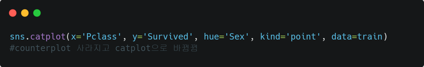 seaborn 라이브러리의 catplot을 활용하여 Sex, Pclass에 따른 생존율을 시각화해보았습니다.