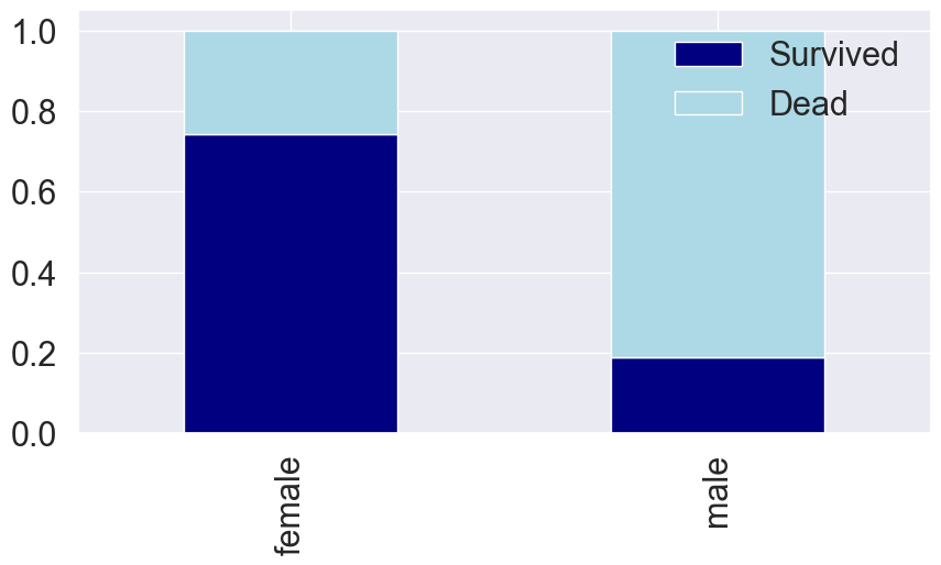 female이 생존자 수도, 생존율도 높음을 확인할 수 있습니다.