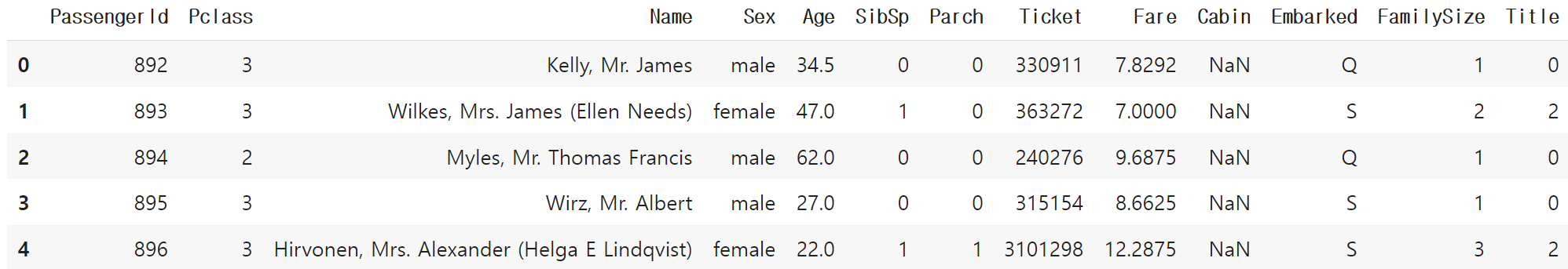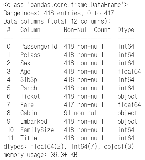 test 데이터셋은 418개의 행과 12개의 열로 이루어져 있음을 확인할 수 있습니다.