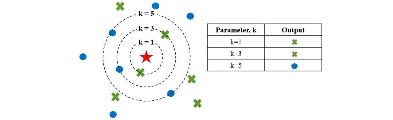 판별하려는 데이터와 인접한 데이터 k개를 찾아 그중 빈도수가 가장 높은 데이터를 범주로 분류합니다.