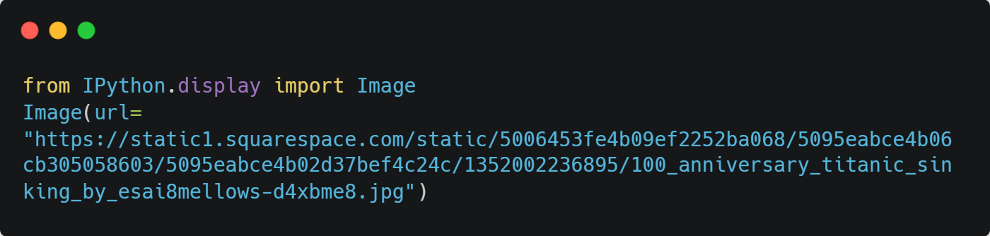 타이타닉호가 침몰하는 사진을 출력하기 위해 Ipython.display 라이브러리를 import 하고 이미지를 주소로 불러왔습니다.