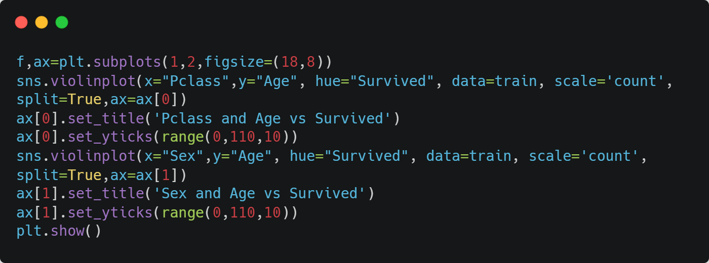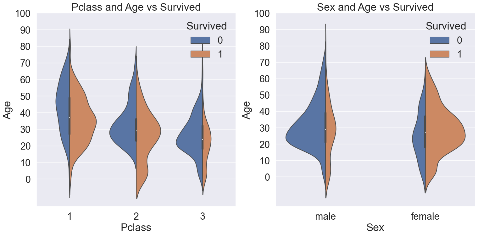 seaborn 라이브러리의 violinplot을 활용하여 Pclass와 Age에 따른 분포, Sex와 Age에 따른 분포를 시각화해 보았습니다.