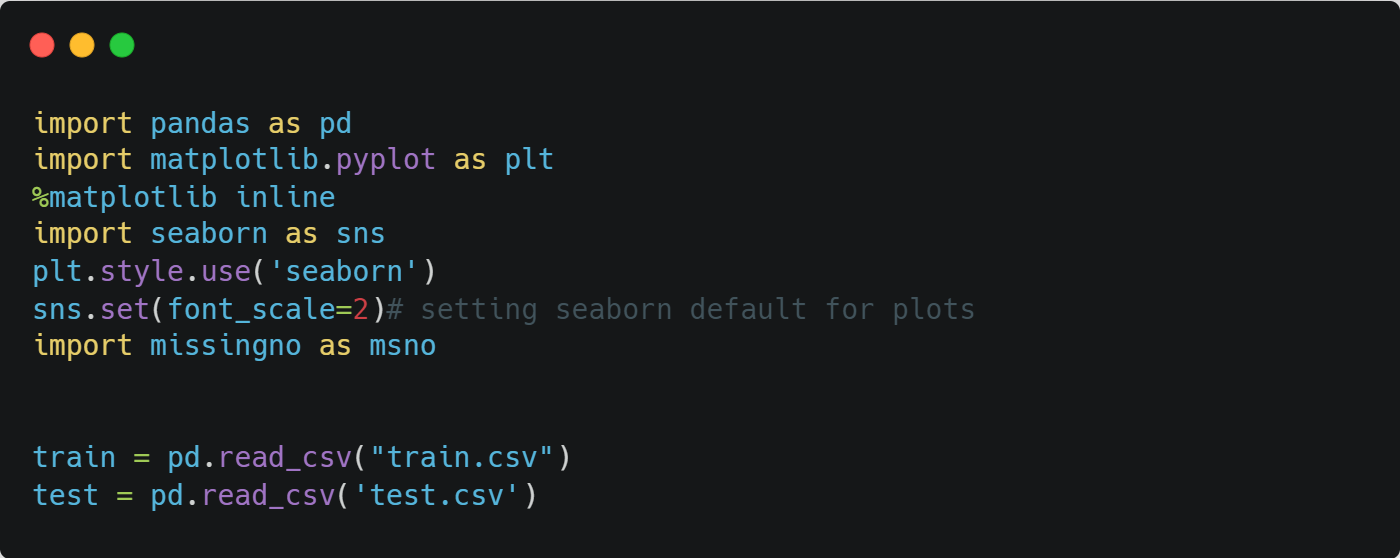 필요한 라이브러리들을 import 하고 train.csv와 test.csv파일을 pandas 라이브러리를 이용하여 읽은 다음 각각 train과 test라는 변수에 저장하였습니다.