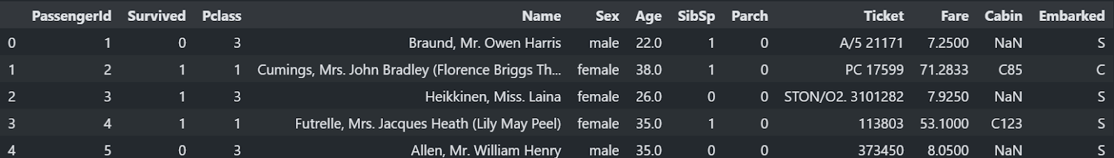 실행 결과 train.csv에는 PassengerId, Survived, Pclass, Name, Sex, Age, SibSp, Parch, Ticket, Fare, Cabin, Embarked로 총 12개의 열이 있음을 확인할 수 있습니다. 각 행이 의미하는 바는 다음과 같습니다.