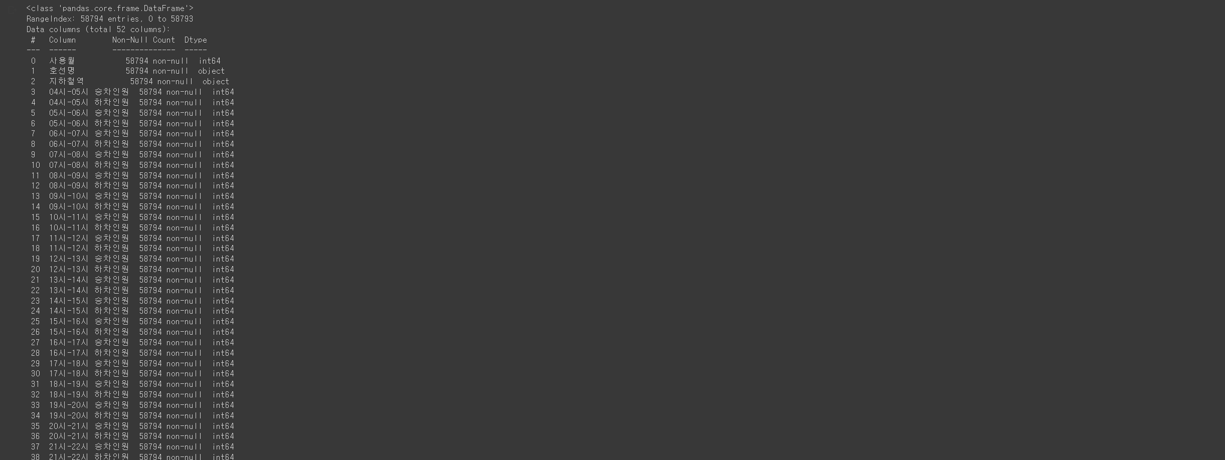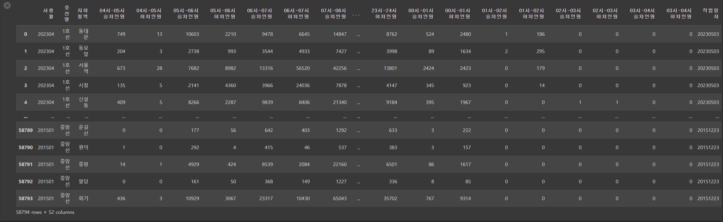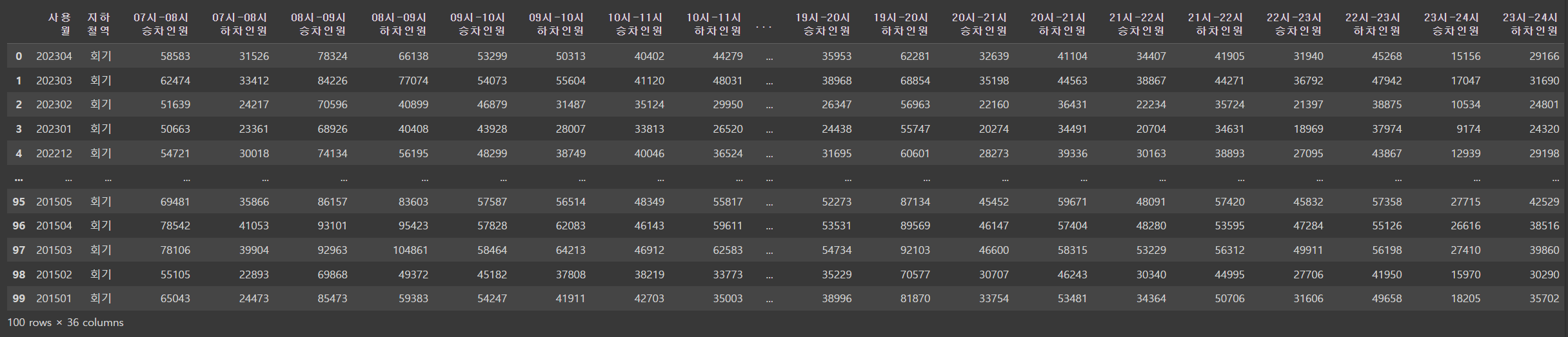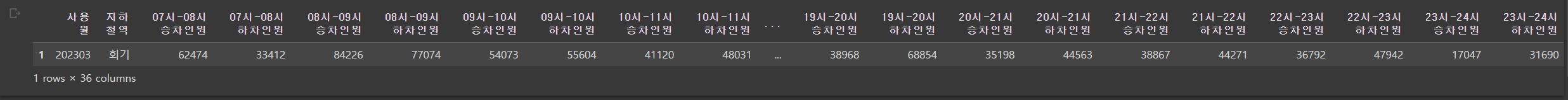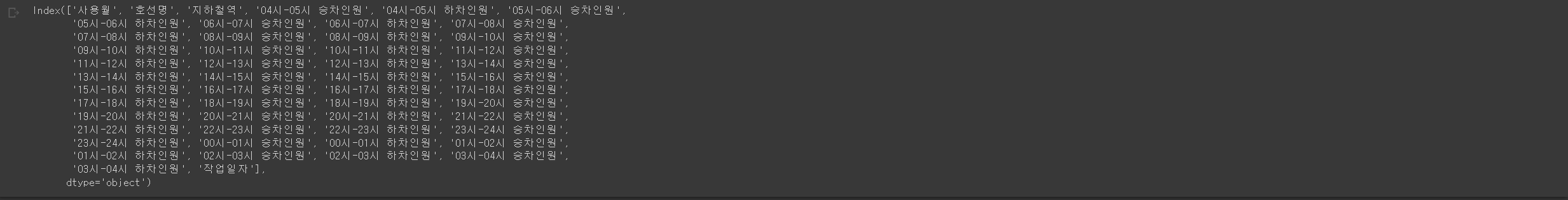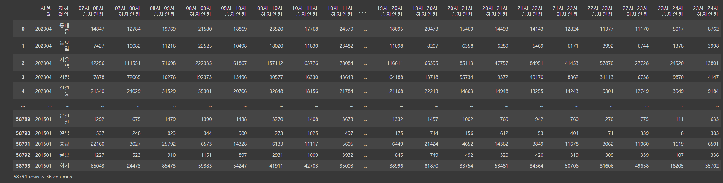 df= rail_p[['사용월','지하철역','07시-08시 승차인원','07시-08시 하차인원', '08시-09시 승차인원', '08시-09시 하차인원', '09시-10시 승차인원','09시-10시 하차인원', '10시-11시 승차인원', '10시-11시 하차인원', '11시-12시 승차인원','11시-12시 하차인원', '12시-13시 승차인원', '12시-13시 하차인원', '13시-14시 승차인원','13시-14시 하차인원', '14시-15시 승차인원', '14시-15시 하차인원', '15시-16시 승차인원','15시-16시 하차인원', '16시-17시 승차인원', '16시-17시 하차인원', '17시-18시 승차인원','17시-18시 하차인원', '18시-19시 승차인원', '18시-19시 하차인원', '19시-20시 승차인원','19시-20시 하차인원', '20시-21시 승차인원', '20시-21시 하차인원', '21시-22시 승차인원','21시-22시 하차인원', '22시-23시 승차인원', '22시-23시 하차인원', '23시-24시 승차인원','23시-24시 하차인원']]