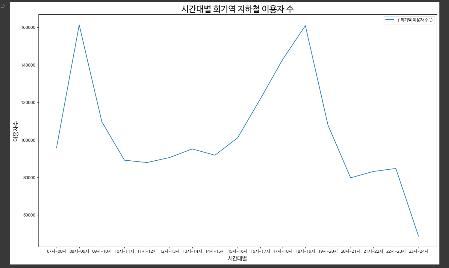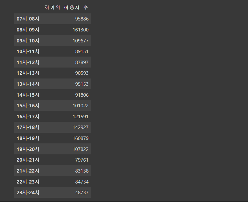 우리 조는 회기역의 시간대별 지하철 이용 인원을 알아보고자 한 것이기 때문에, 승차 인원과 하차 인원을 구분하지 않고 시간대별 승차 인원과 하차 인원을 합쳐서 시간대별 지하철 이용 인원을 나타내기로 하였다. 따라서, 위 코드를 통해 시간대별 승차 인원과 하차 인원을 합친 데이터프레임 df_sum을 생성하였다.