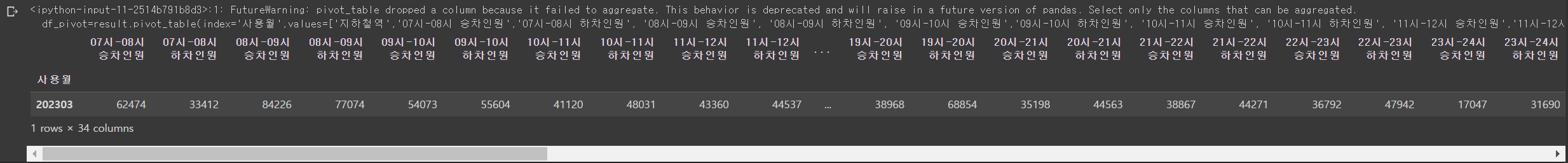 df_pivot=result.pivot_table(index='사용월',values=['지하철역','07시-08시 승차인원','07시-08시 하차인원', '08시-09시 승차인원', '08시-09시 하차인원', '09시-10시 승차인원','09시-10시 하차인원', '10시-11시 승차인원', '10시-11시 하차인원', '11시-12시 승차인원','11시-12시 하차인원', '12시-13시 승차인원', '12시-13시 하차인원', '13시-14시 승차인원','13시-14시 하차인원', '14시-15시 승차인원', '14시-15시 하차인원', '15시-16시 승차인원','15시-16시 하차인원', '16시-17시 승차인원', '16시-17시 하차인원', '17시-18시 승차인원','17시-18시 하차인원', '18시-19시 승차인원', '18시-19시 하차인원', '19시-20시 승차인원','19시-20시 하차인원', '20시-21시 승차인원', '20시-21시 하차인원', '21시-22시 승차인원','21시-22시 하차인원', '22시-23시 승차인원', '22시-23시 하차인원', '23시-24시 승차인원','23시-24시 하차인원'])
