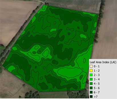 (바이오매스 매핑에는 밝은 노란색(낮은 LAI)에서 진한 녹색(높은 LAI)까지의 색상스케일이 포함된다.)