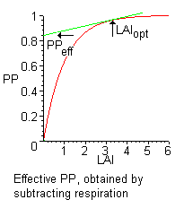 여기서 PPeff는 가장 효율적인 생산량을 의미하는데, 이를 보면 가장 효율적인 PP는 LAI의 크기에 무조건적으로 비례하지는 않는 것을 알 수 있다. 이는 광선포화, 제한적인 주변 자원과 경쟁등등의 이유로 LAI와 PP는 역지수적인 관계를 띄게 되는 것이다.