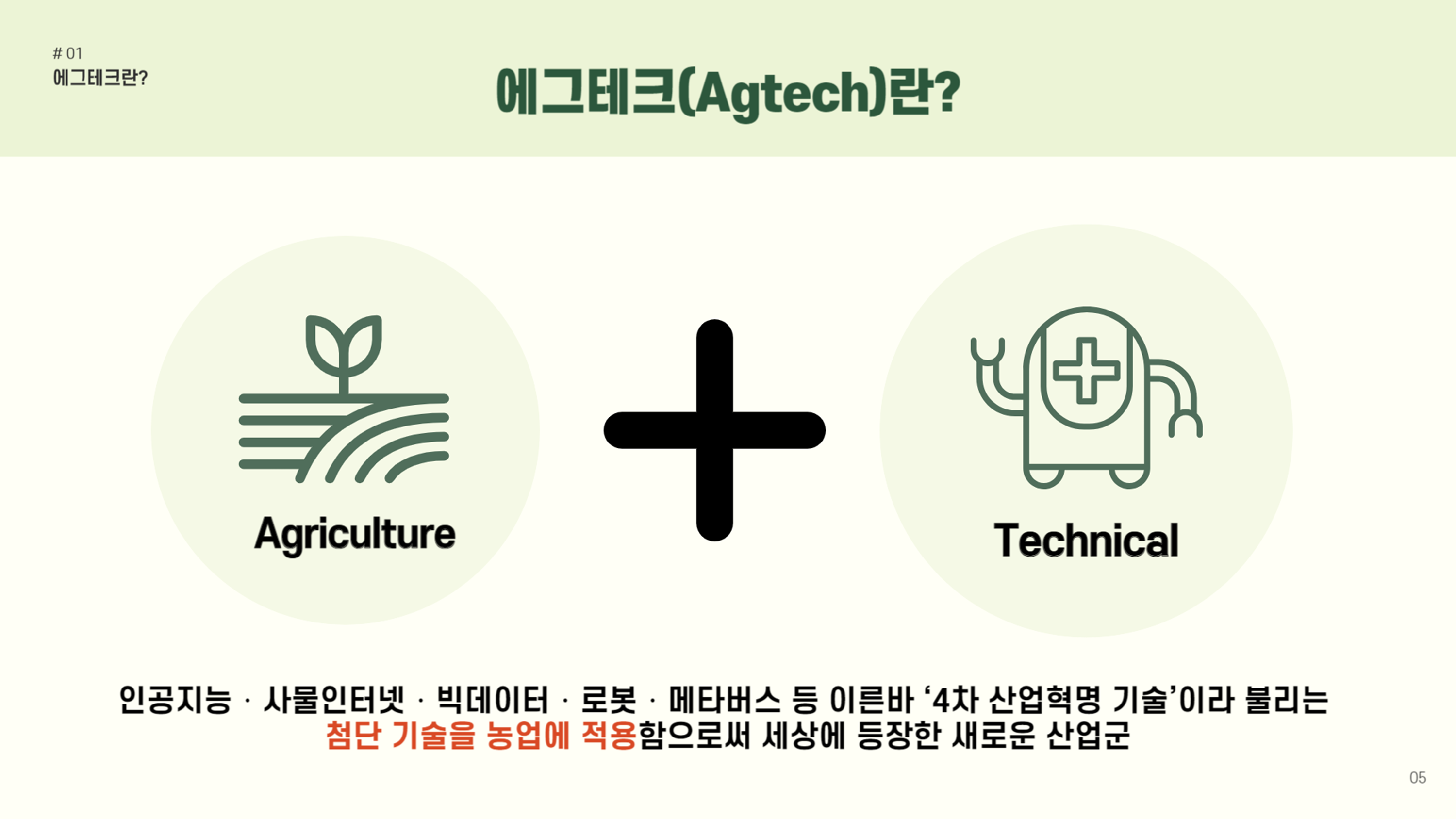 바로 애그테크입니다. 애크테크는 인공지능‧사물인터넷‧빅데이터‧로봇‧메타버스 등 이른바 ‘4차 산업혁명 기술’이라 불리는 첨단 기술을 농업에 적용함으로써 생산성을 높이고 상품의 질을 향상시키는 산업을 의미합니다.