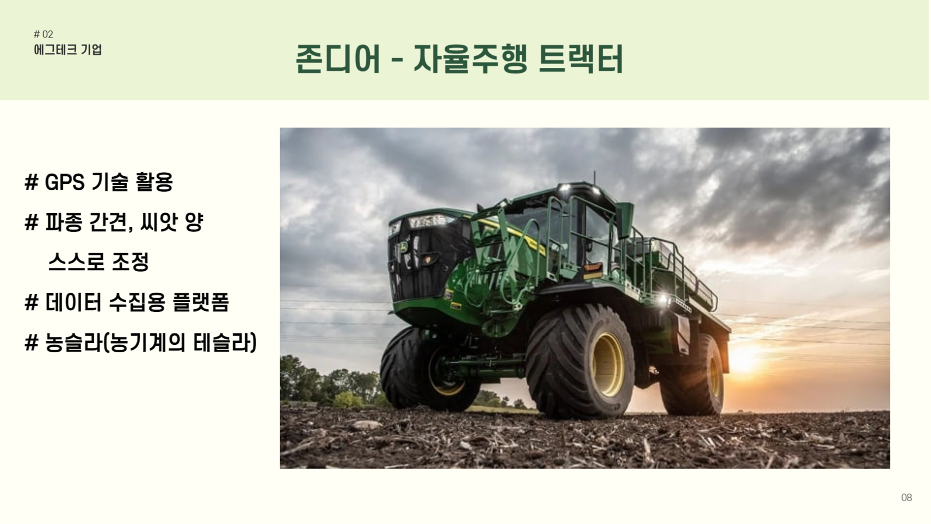 먼저 첫 번째는 농기계 선두 주자인 존디어입니다. 이 기업은 GPS 기술을 활용한 무인 트랙터를 통해 파종 간격이나 씨앗 양을 스스로 조정하고 농기계 부품의 노후화를 자동으로 체크하기도 합니다. 농기계의 용도를 단순한 작물 재배용 기계에서 데이터 수집용 플랫폼으로 변신시키면서 ‘농슬라 즉 농기계의 테슬라라는 별칭을 얻고 있기도 합니다. 특히 존디어는 클라우드 기반의 소프트웨어 스타트업인 DN2K를 인수해 농기계 작업 중에 수집한 데이터를 기반으로 농작물을 원격으로 확인하고 재배 환경을 실시간으로 제어하는 서비스를 선보이기도 했습니다.