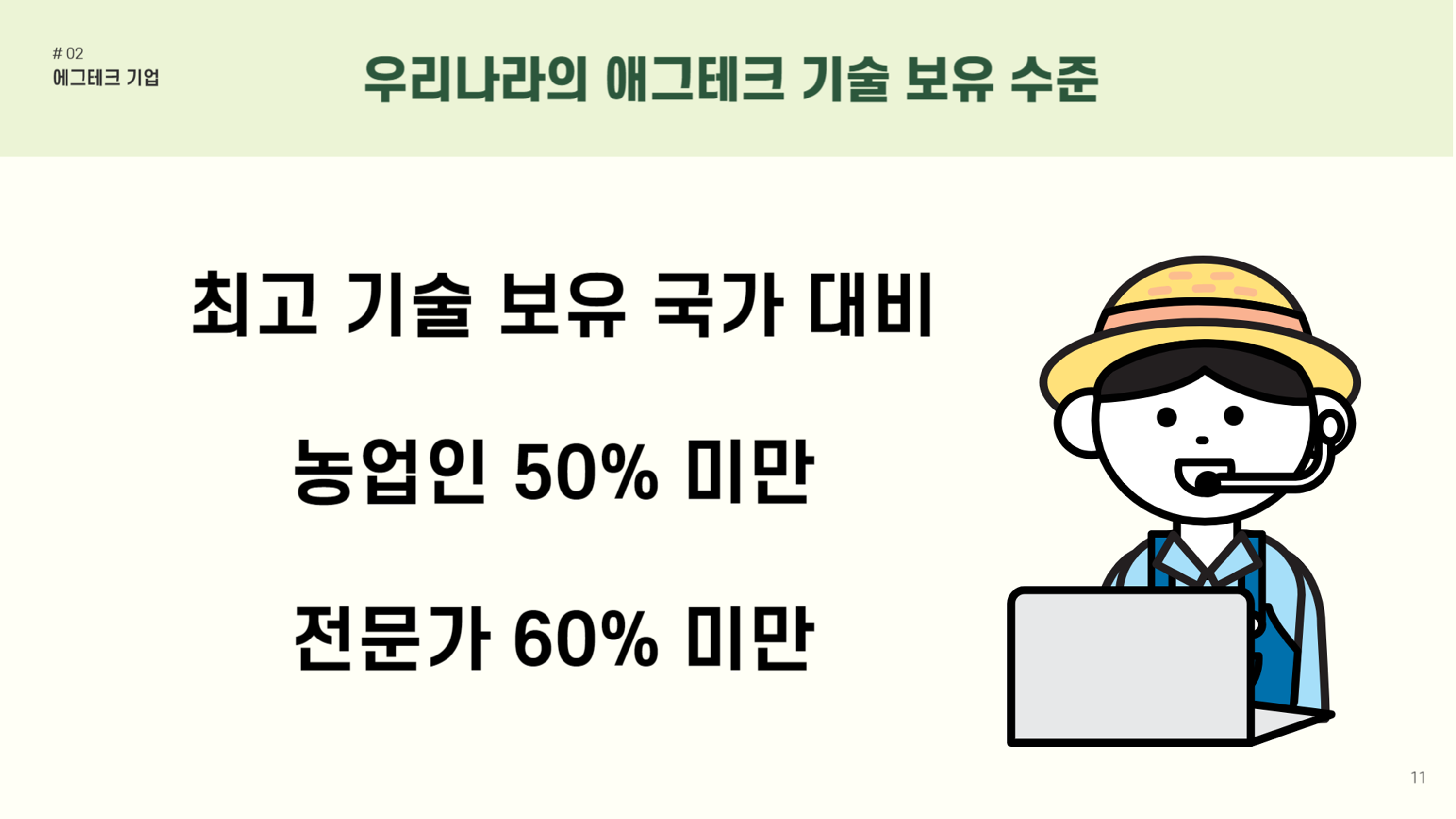 이외에도 국내에도 다양한 애그테크 기업이 있지만, 국내 애그테크는 아직 걸음마 수준에 불과합니다. 한국농촌경제연구원은 농업인의 경우 최고 기술 보유 국가 대비 50% 미만, 전문가는 60% 미만의 애그테크 기술 수준을 보유하고 있는 것으로 평가했습니다. 정부 및 공공기관이 국내 애그테크 산업 지원 및 기술 개발에 더욱 적극적으로 나서야 하는 상황입니다.