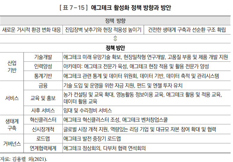 다음은 농업관측센터에서 발표한 애그테크(AgTech)의 성장가능성과 활성화 방안 (2022,이정민,김용렬,최재현)에서 가져온 에크태크 활성화 방향입니다.