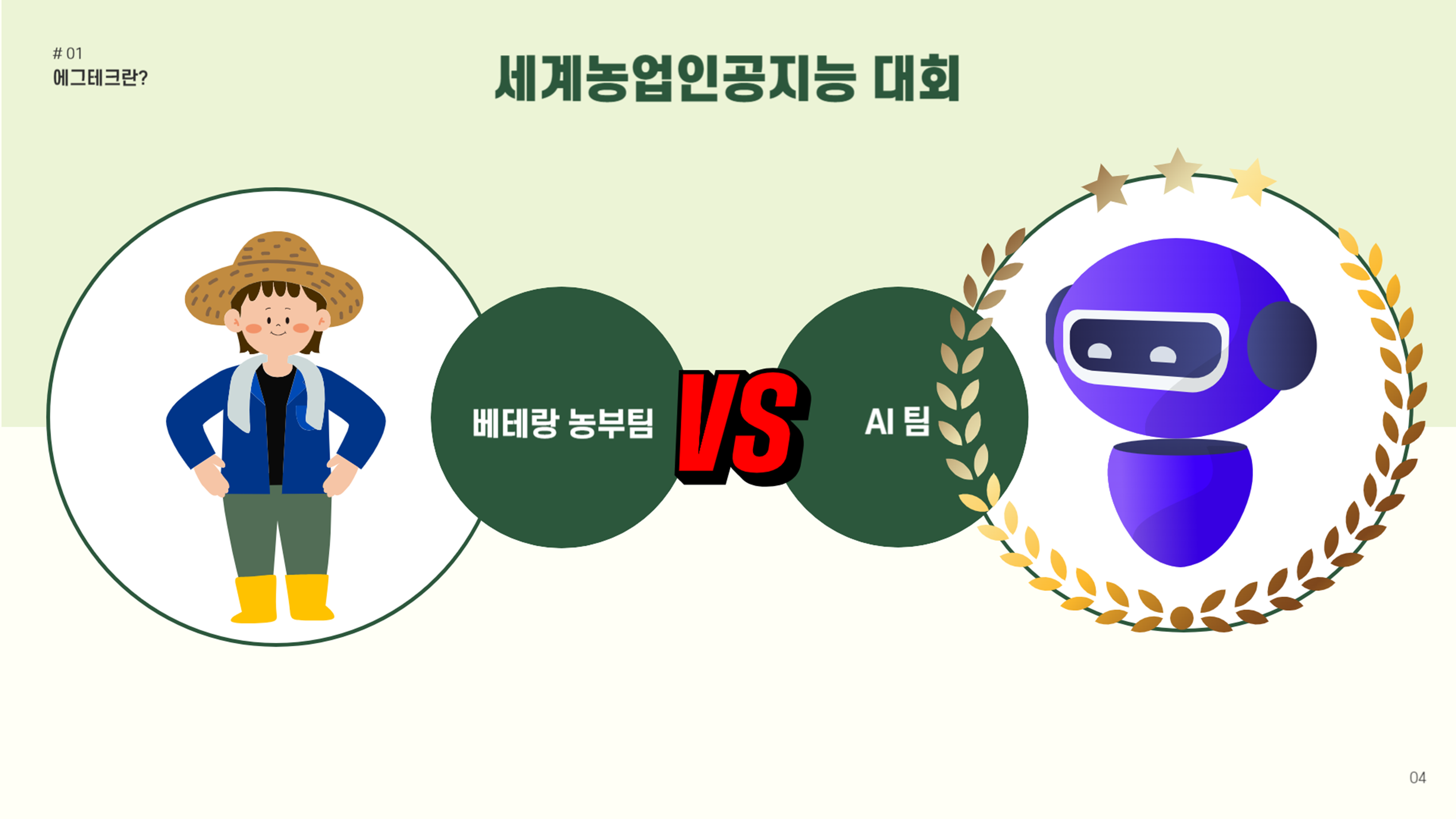 2018년 네덜란드에서 열린 인공지능과 사람 농부 중 누가 더 농작물을 잘 키우는지를 겨루는 ‘1회 세계농업인공지능(AI) 대회’에서 AI 연구팀이 네덜란드의 베테랑 농부팀을 제치고 1위를 차지했습니다.