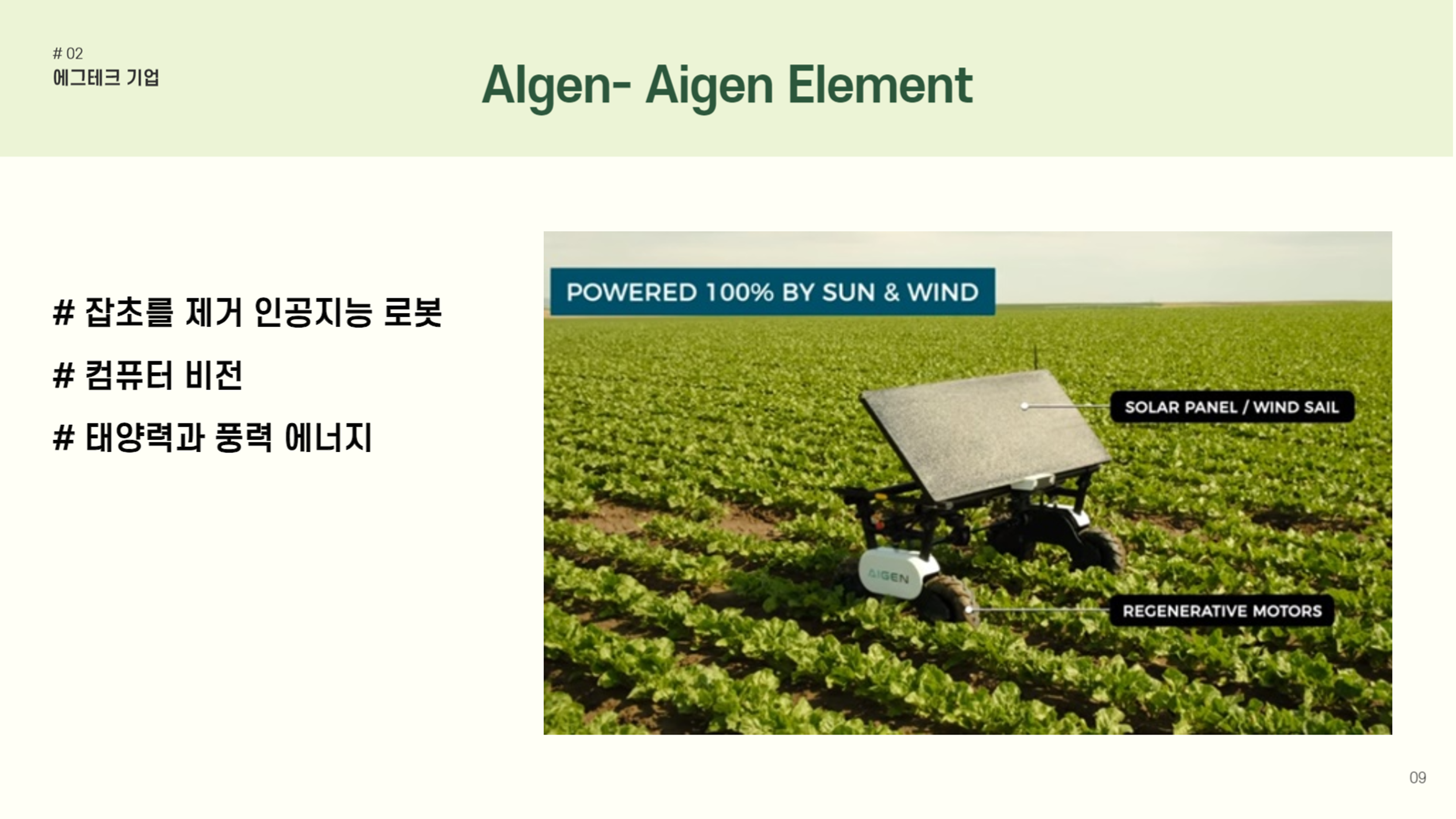 미국 애그테크 스타트업 아이젠(AIgen)은 농경지 내 잡초를 제거하는 인공지능 로봇 ‘아이젤엔리먼트(Aigen Element)’를 출시했습니다. 이미지와 비디오를 처리해 유의미한 정보를 추출하는 AI 기술인 컴퓨터 비전이 일반 작물과 잡초를 구분하고 하단에 설치된 로봇팔이 잡초를 제거합니다. 또한 로봇 상단에 태양광 패널과 풍력 돛을 장착하여 태양력과 풍력 에너지로 가동됩니다.