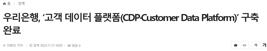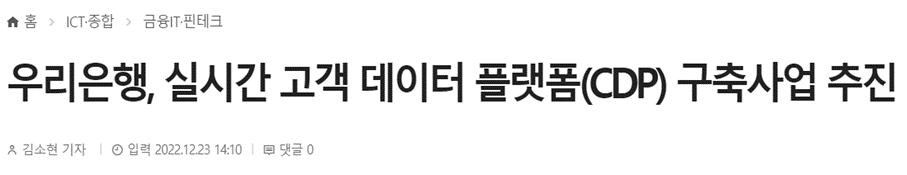 작년 12월 기사를 보면 우리은행이 실시간 고객 데이터 플랫폼 구축 사업을 추진을 한다는 내용이 있습니다. 그리고 놀랍게도 어제, 우리은행에서 고객 데이터 플랫폼 구축을 완료했다는 따끈따끈한 기사가 올라왔습니다. 그럼 지금부터 고객 데이터 플랫폼 일명 cdp에 대해 알아보겠습니다.
