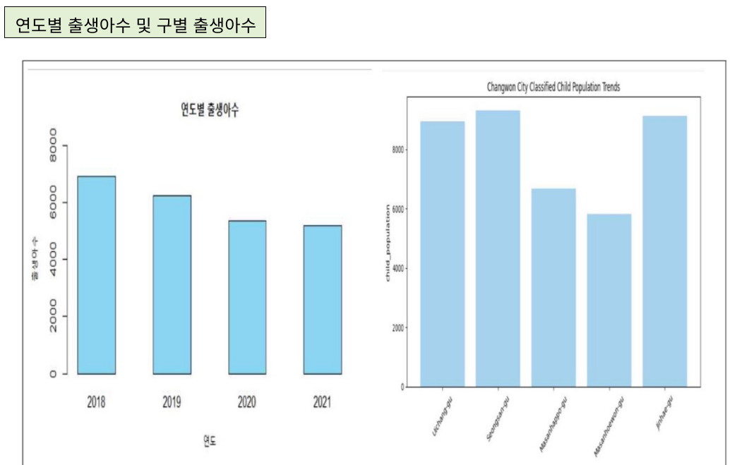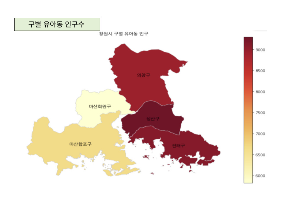 창원시는 의창구, 마산회원구, 성산구, 진해구, 마산함포구로 총 5개의 구가 있다. 분석결과, 2021년 기준 성산구, 진해구, 의창구, 마산회원구, 마산함포구 순으로 유아동 인구수가 많다.