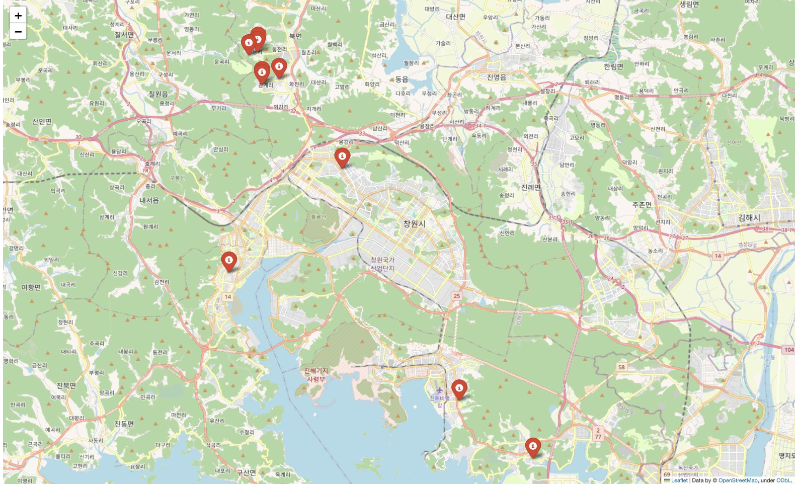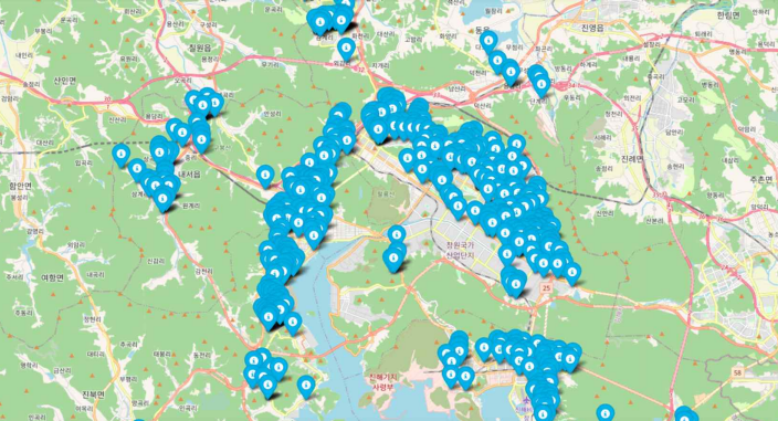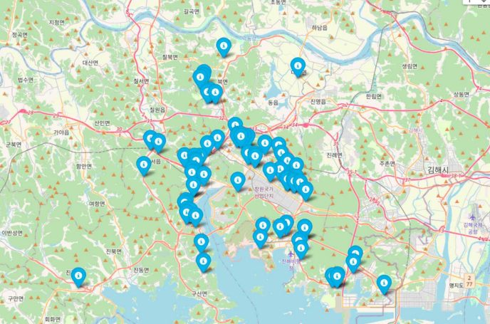 현재의 창원시 내 국공립을 파란색 마커로, 선정된 어린이집을 빨간색 마커로 표시하여 시각화 한 것입니다.