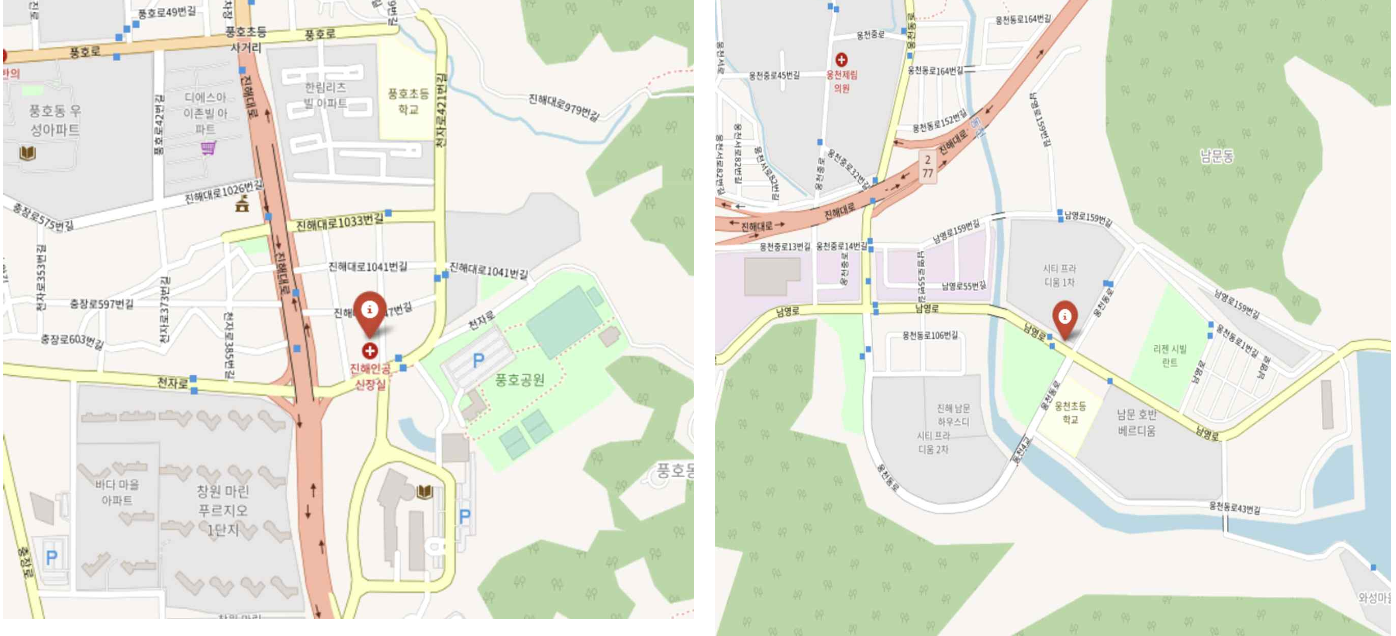 다음으로 어린이들의 안전한 등하교를 위하여 창원시 내 어린이 보호 구역 위치도 확인해보았다. 특히 차도가 설치된 곳 주위에 창원시 곳곳 골고루 어린이 보호 구역이 존재하며, 앞서 확인한 어린이집들의 위치와 의료기관과 동일 하거나 가까운 위치에 있음을 알 수 있었다. 어린이 보육시설인 만큼, 안전을 위하여 보호 구역 내 또는 가까이에 입지를 선정하는 것을 중요하게 생각했다.