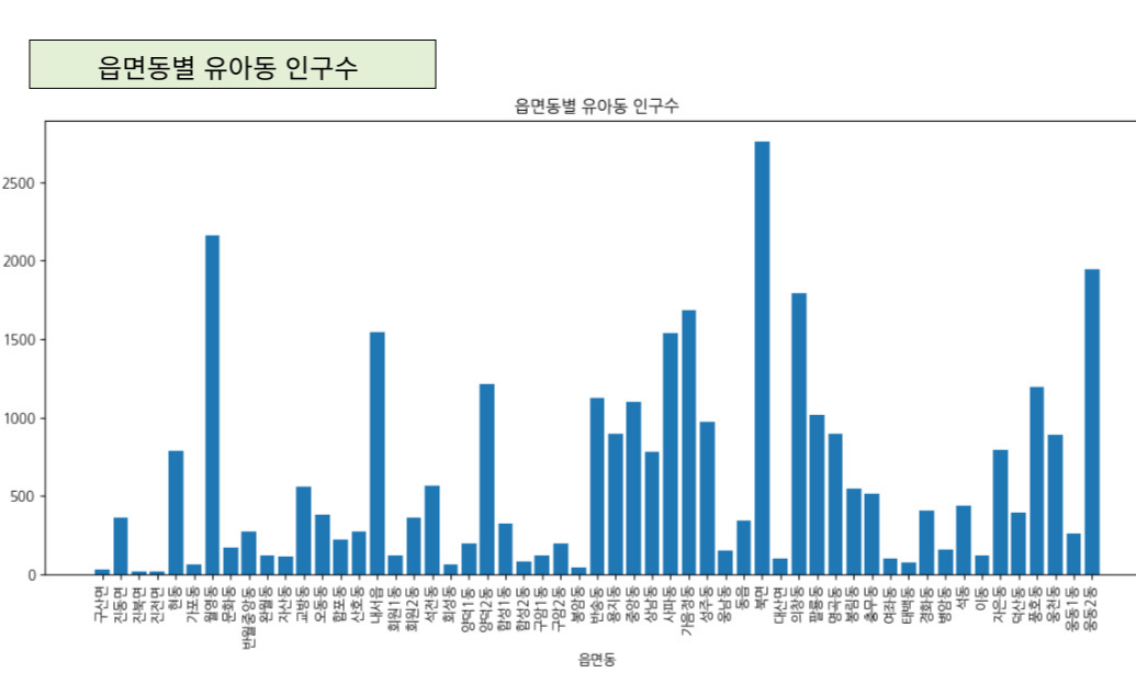 또한, 읍면동 별 유아동 인구수도 분석해보았다. 그래프를 보면 알 수 있듯이 의창구 북면의 유아동 인구수가 다른 읍면동 유아동인구수보다 상대적으로 많음을 알 수 있다. 유아동인구의 수요가 많은 곳에 어린이집을 세우는 것이 합당하다고 판단을 했다. 최종적으로 유아동 인구수를 분석 함으로써 저출산 시대의 틀에 맞춘 어린이집 확충 사업의 필요성을 정당화 할수 있었다.