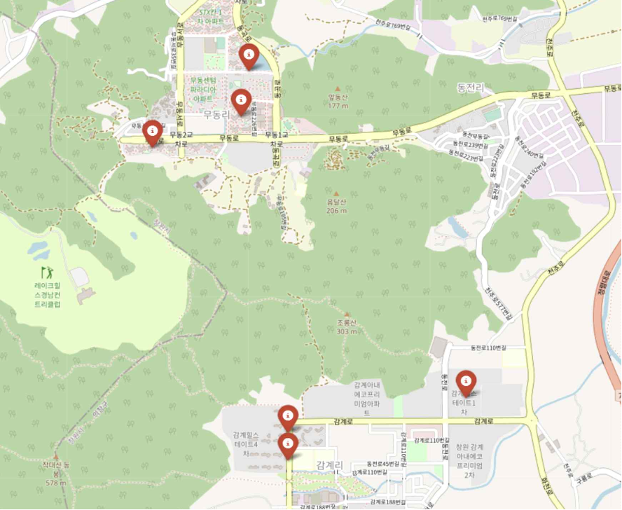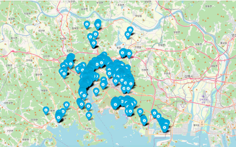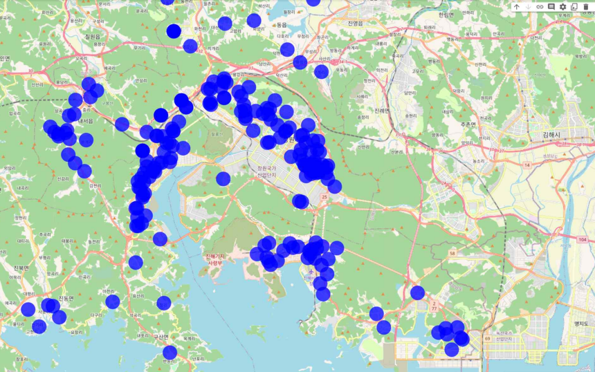 어린이집 수와 더불어 현재 창원시에 존재하는 전체 어린이집 위치를 지도에 시각화해보았다. 그 결과는 다음과 같다.