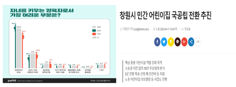 올해 4월, 창원시가 민간 어린이집을 국공립 어린이집으로 전환한다는 기사를 봤다. 창원시 사업취지는 핵심 돌봄 기반시설의 역할을 강화하고 안심보육 환경을 조성하기 위해서라고 한다. 우리는 "핵심 돌봄 기반시설의 역할 강화"와 "안심보육 환경 조성", 이 2가지 키워드에 집중하였다. 먼저, 핵심 돌봄 기반시설의 역할 강화는 바로 현재 시점에서 국가가 지원해야할 부분이다. 자녀가 있는 부부 절반 이상이 저출산 현상의 원인으로 '경제부담'을 지목했다는 조사 결과가 있다. 경제적 부담이 큰 부모들에게 비교적 학비가 싼 국공립 어린이집의 전환은 희소식이다. 또한, 육아와 직장생활을 균형있게 유지하려는 부모들에게 더 큰 선택의 폭을 제공하며 '안심'하고 아이들을 어린이집에 보낼 수 있다.