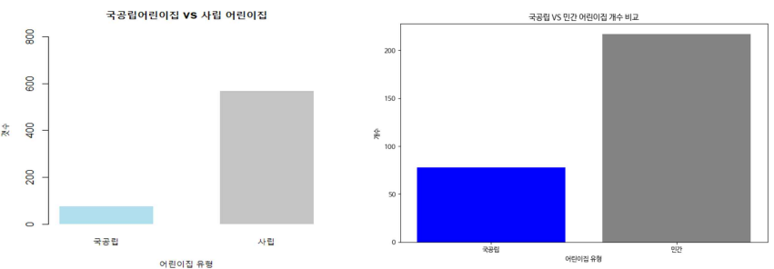 다음으로 사립 어린이집 가운데 민간 어린이집 데이터만 추출하여 국공립 어린이집과 비교해보았다. 그 결과인 오른쪽 그래프를 살펴보면, 민간어린이집 또한 국공립 어린이집보다 약 3배 많은 것을 알 수 있다.