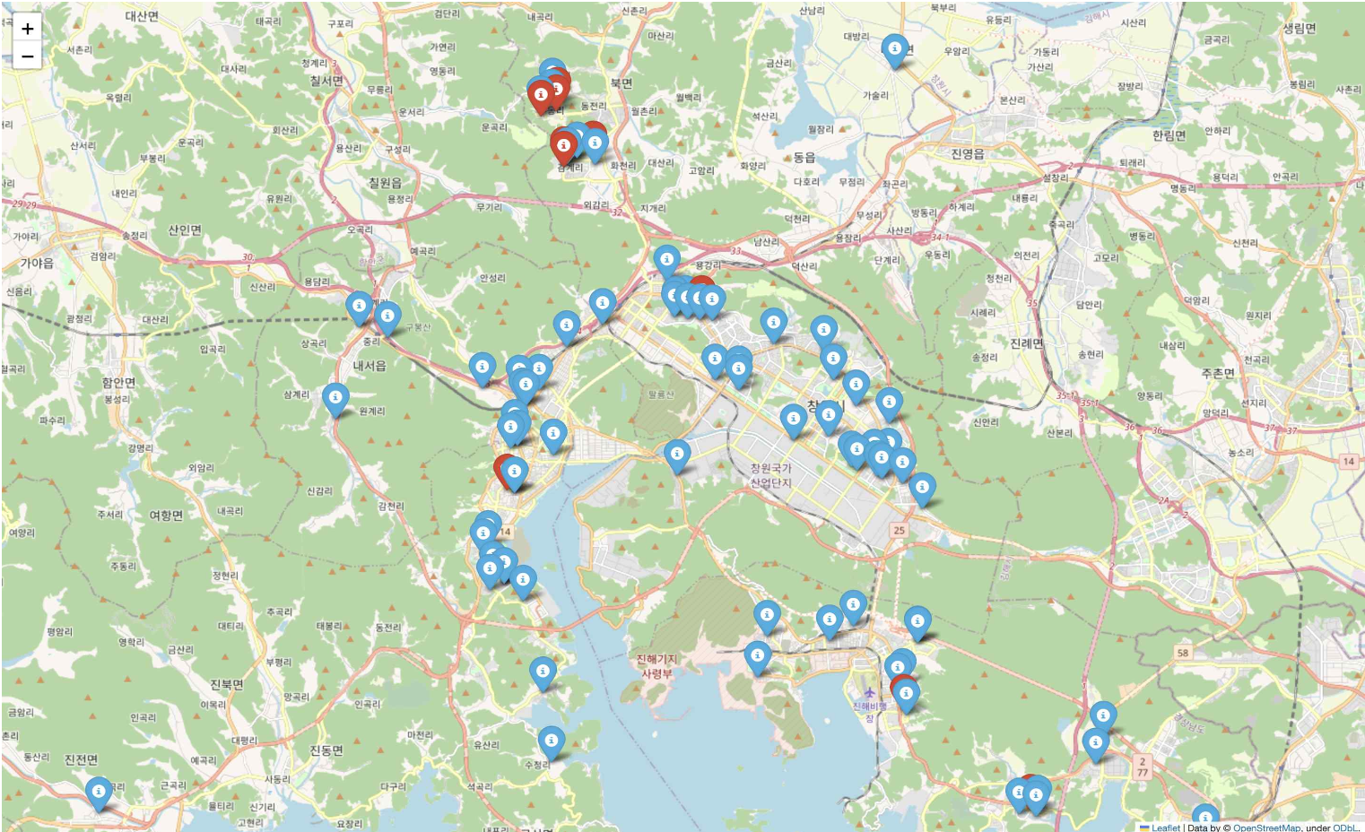 현재의 창원시 내 국공립을 파란색 마커로, 선정된 어린이집을 빨간색 마커로 표시하여 시각화 한 것입니다.