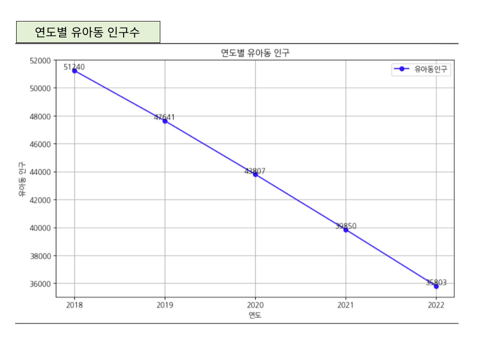 창원시의 2018년 부터 2022년 만 0세~ 만 5세의 인구수를 시각화 하였다. 분석 결과 해마다 유아동 인구가 하락세를 보인다. 전 년도와 다음 년도(+1) 차이는 차례대로 각각 3599명, 3834명, 3957명 , 4047명으로, 하락 폭이 점점 커지고 있다. 또한, 2018년도 대비 2022년 유아동 인구수가 약 0.69배까지 떨어졌다. (※ 2022년 유아동 인구수/ 2018년 유아동 인구수 =0.69873146) .2023년도 이후는 아동수가 더 큰 폭으로 감소할것으로 예상된다.