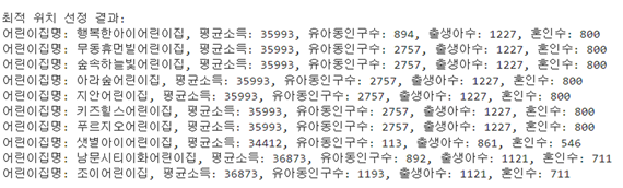 print("최적 위치 선정 결과:")