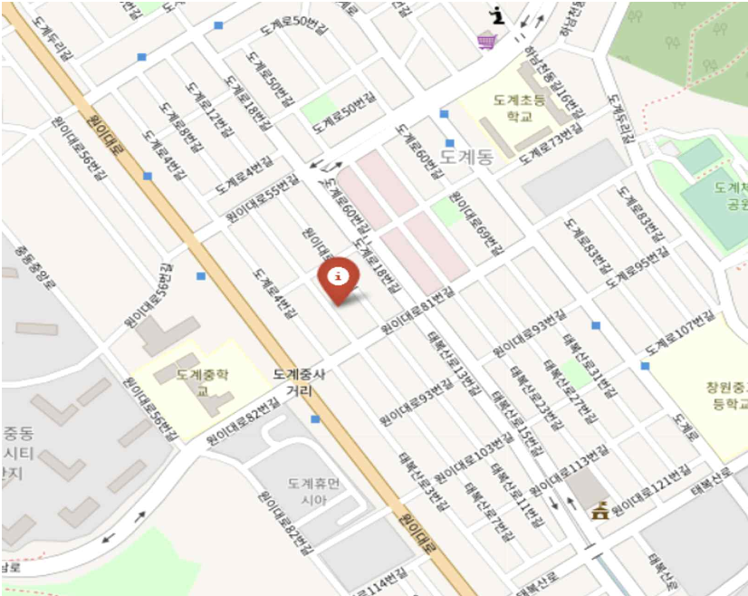 다음으로 어린이들의 안전한 등하교를 위하여 창원시 내 어린이 보호 구역 위치도 확인해보았다. 특히 차도가 설치된 곳 주위에 창원시 곳곳 골고루 어린이 보호 구역이 존재하며, 앞서 확인한 어린이집들의 위치와 의료기관과 동일 하거나 가까운 위치에 있음을 알 수 있었다. 어린이 보육시설인 만큼, 안전을 위하여 보호 구역 내 또는 가까이에 입지를 선정하는 것을 중요하게 생각했다.