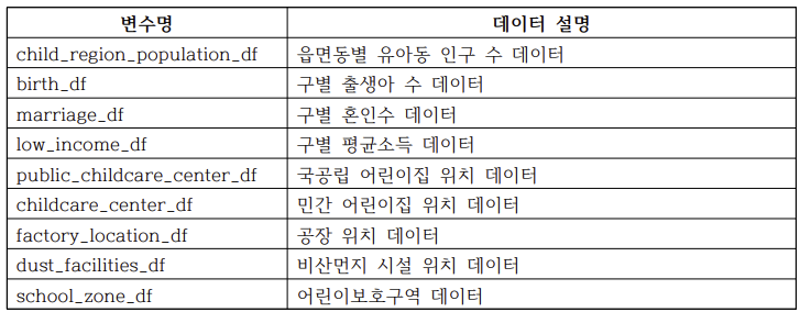 비산 먼지 시설 위치 데이터는 종료일 기준으로 전처리해주고, 민간 어린이집 위치 데이터는 소재지 도로명 주소를 이용해서 읍면동을 추출한 뒤에 이상값만 제거했다. 민간 어린이집을 국공립 어린이집으로 전환하는 것이 목표이기 때문에 이상값을 제외한 민간 어린이집만 남도록 하여 이후 모델링에 사용하기 위함이다. 이외의 데이터 전처리는 결측치 제거, 이상값 처리 등과 같이 진행했다.